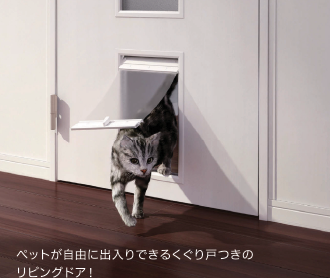 全室、リビングのドアにペットが自由に出入りできる、くぐり戸がついています。使わない時のためのロック機能もついています。