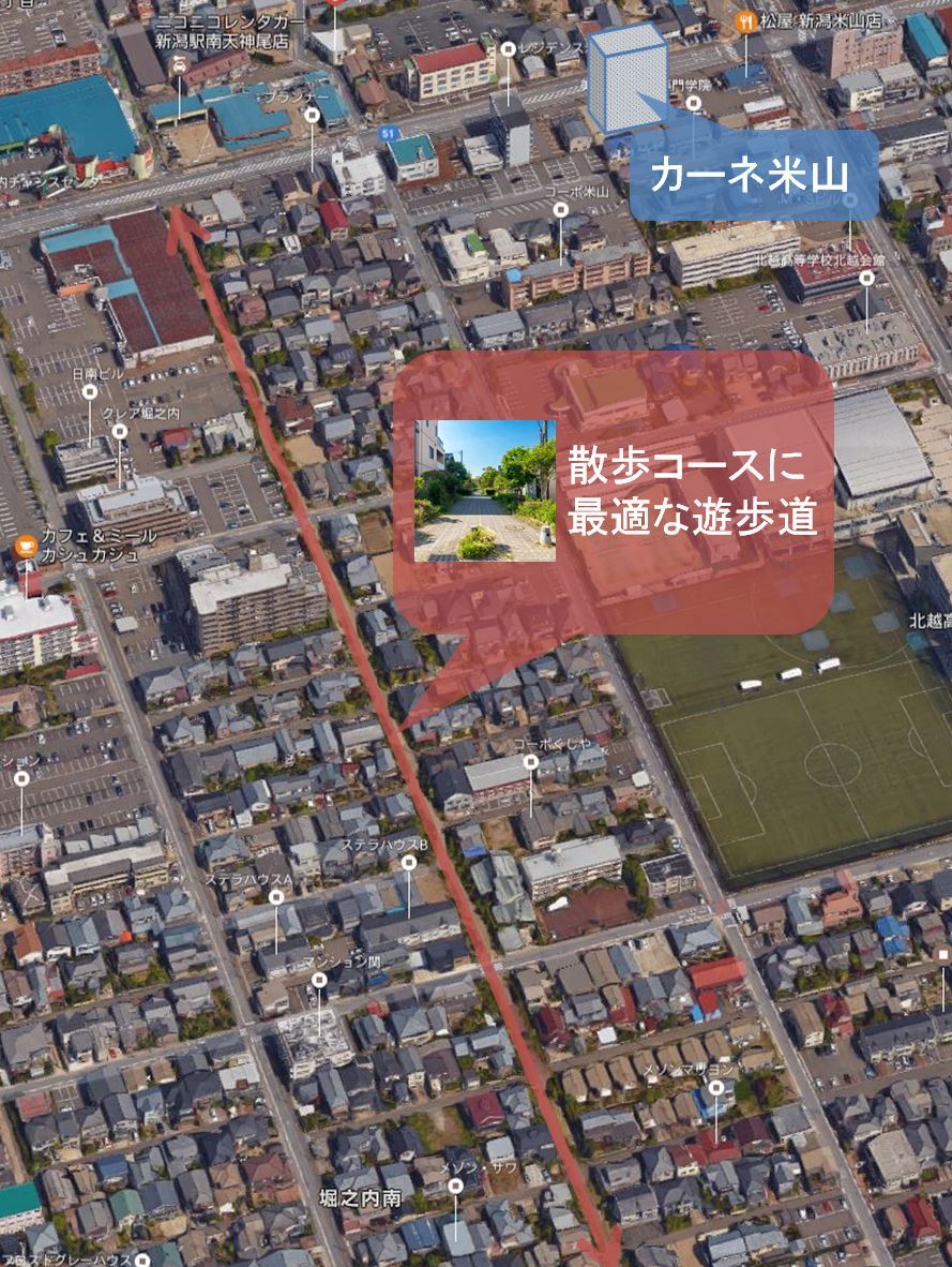 ここは、通勤やお買い物に便利な新潟駅まで約1km、万代シテイまで約2km。行楽に便利な鳥屋野潟まで約1.8kmという場所にあります。 すぐ近くには犬の散歩スポットとしてにぎわう遊歩道もあるので、まさに“都市と自然のクロスする場所” 申し 分のない、好立地です。